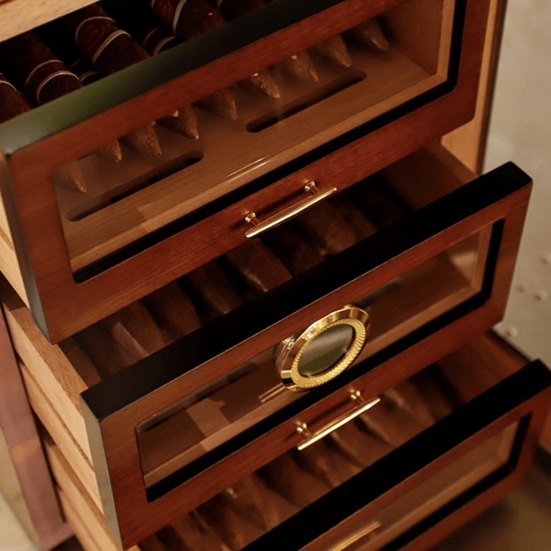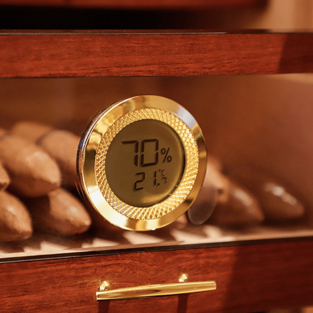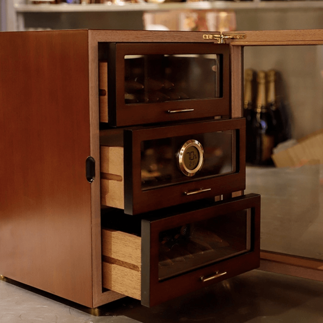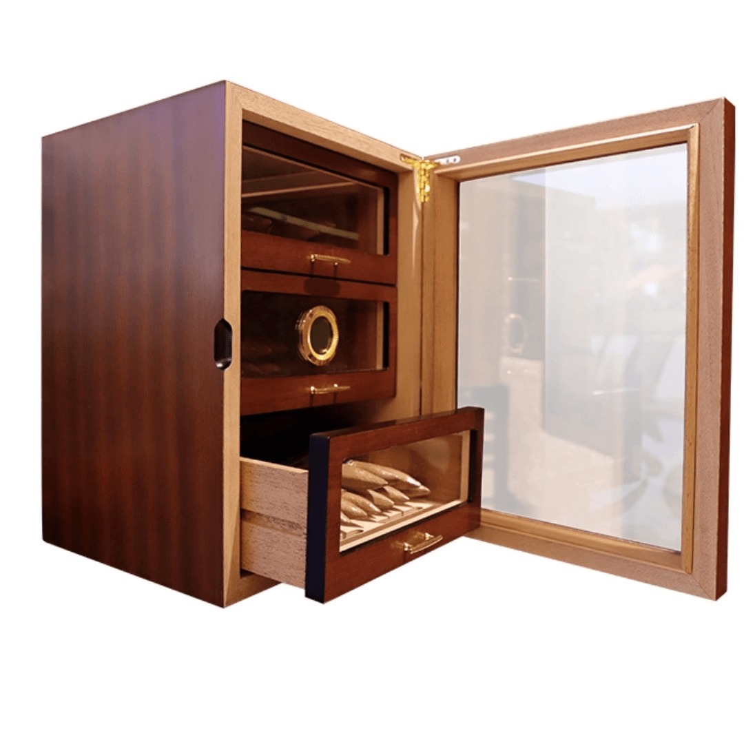 Ovaj sofisticirani humidor namenjen je pravilnom čuvanju tompusa u idealnim uslovima. Izrađen je od kombinacije drveta i stakla, sa pažljivo uklopljenim zlatnim detaljima koji mu daju luksuzan izgled i čine ga upečatljivim dekorativnim elementom