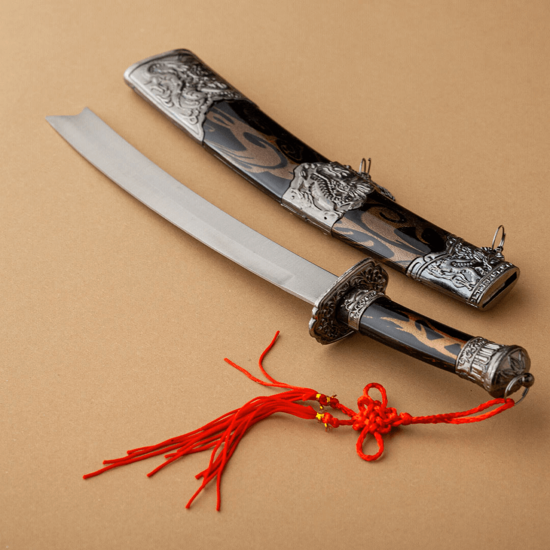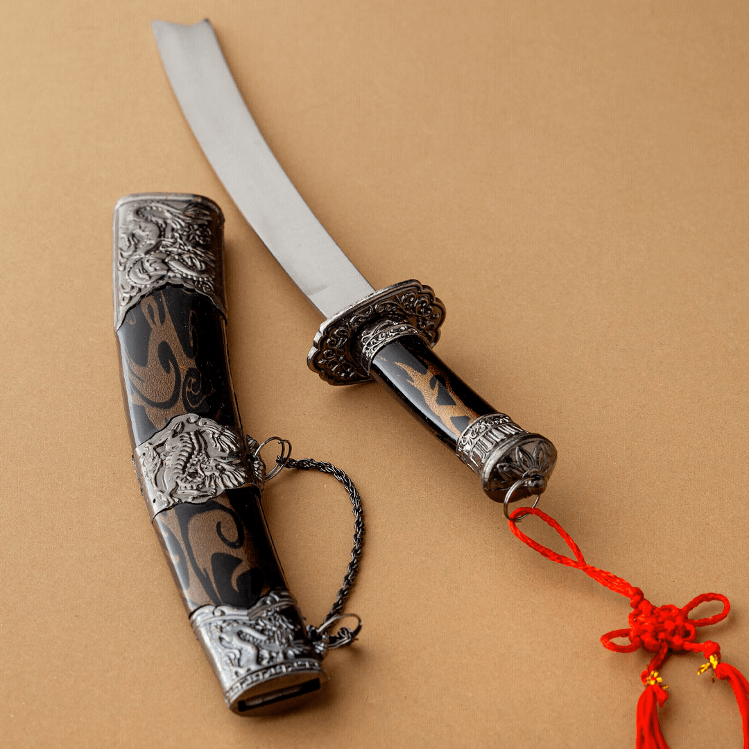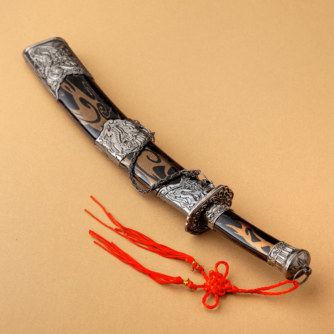 Istočni mač sa futrolom u smeđoj i crnoj boji, ukrašen metalnim aplikacijama urezanim u obliku „zmajeva“ i „demona“, što je karakteristično za istočnu mitologiju. Drška mača je u istom stilu, sa crvenim ukrasom koji upotpunjuje njegov jedinstveni izgled.